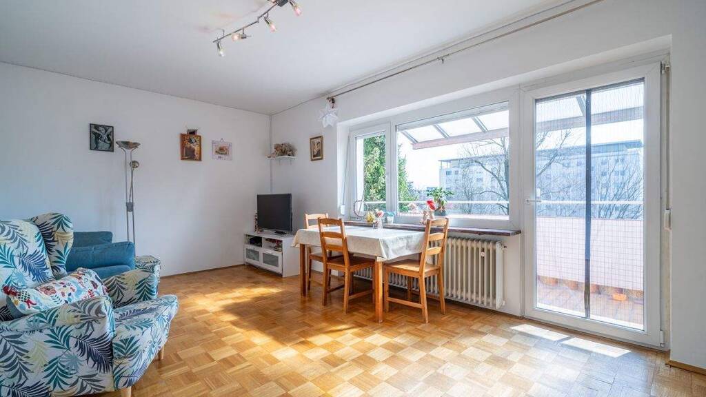 Die Wohnung befindet sich im 4. Obergeschoss eines Mehrfamilienhauses mit Aufzug und besticht durch einen klar strukturierten Grundriss. Vom großzügigen Flur aus sind sämtliche Räume harmonisch erschlossen. Das Wohnzimmer bildet den Mittelpunkt des Wohnens und eröffnet den Zugang zum Balkon. Von hier aus genießen Sie einen weiten Blick über die Umgebung bis hin zur Alpenkette. Die erhöhte Lage schafft ein angenehm offenes Wohngefühl und unterstreicht die besondere Wohnqualität dieser Einheit. Ergänzt wird das Raumangebot durch ein Schlafzimmer sowie ein weiteres Zimmer, das sich flexibel als Kinder-, Arbeits- oder Gästezimmer nutzen lässt. Die separate Küche wurde im Jahr 2018 modernisiert und präsentiert sich funktional sowie modern gestaltet. Im selben Zuge erfolgte die Modernisierung des Badezimmers sowie Teilen der Elektrik. Ein eigenes Kellerabteil sowie eine im Kaufpreis bereits inkludierte Einzelgarage runden das Angebot komfortabel ab und bieten wertvollen zusätzlichen Stauraum sowie eine sichere Parkmöglichkeit im städtischen Umfeld.