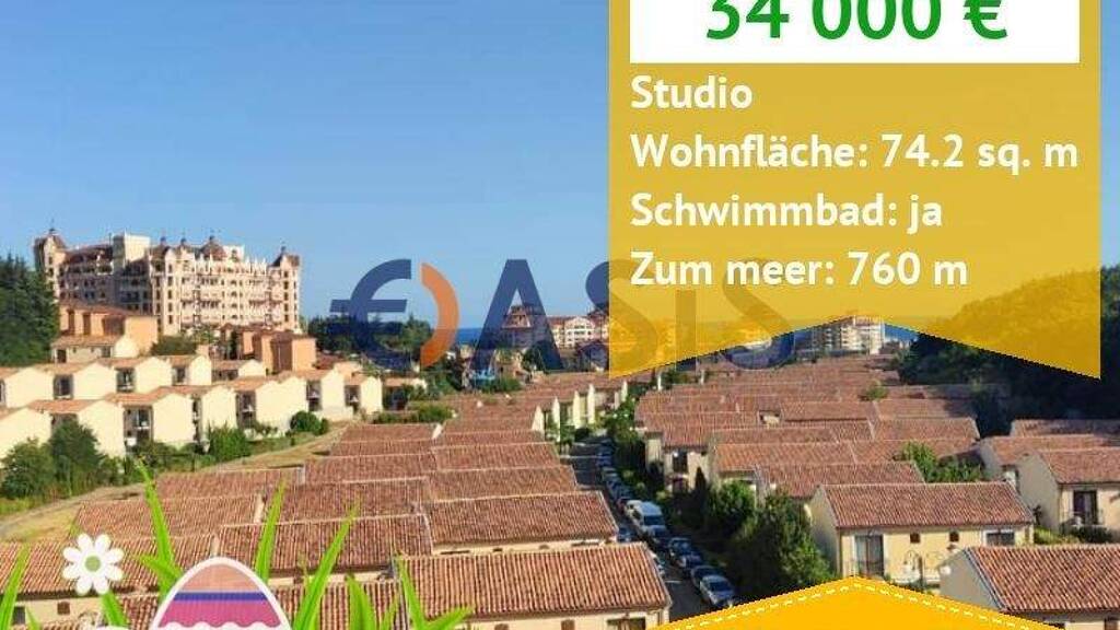 Wir bieten zum Verkauf ein komplett ausgestattetes, geräumiges Studio mit einer großen Panoramaterrasse und einem atemberaubenden Blick auf das Meer und die Berge an. Das Apartment befindet sich in einem Luxus-Komplex «Negresco» im Ferienort Elenite, nur 760 Meter vom breiten Sandstrand entfernt. Die Gesamtfläche beträgt 74,23 m2. In Planung: helles Wohnzimmer mit Küchenbereich, Ruhebereich, geräumiges Badezimmer mit Badewanne und Außenterrasse, ideal für die Aussicht und die Erholung an der frischen Luft.