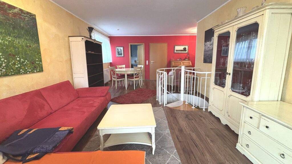 Diese 2-Zimmer-Eigentumswohnung befindet sich im Erdgeschoss eines gepflegten Mehrfamilienhauses mit 8 Wohneinheiten. Das Haus wurde laut Energieausweis ca. 1996 erbaut. Mit ca. 63 m² Wohnfläche bietet die Wohnung eine praktische Raumaufteilung über zwei Etagen verbunden über eine Wendeltreppe.