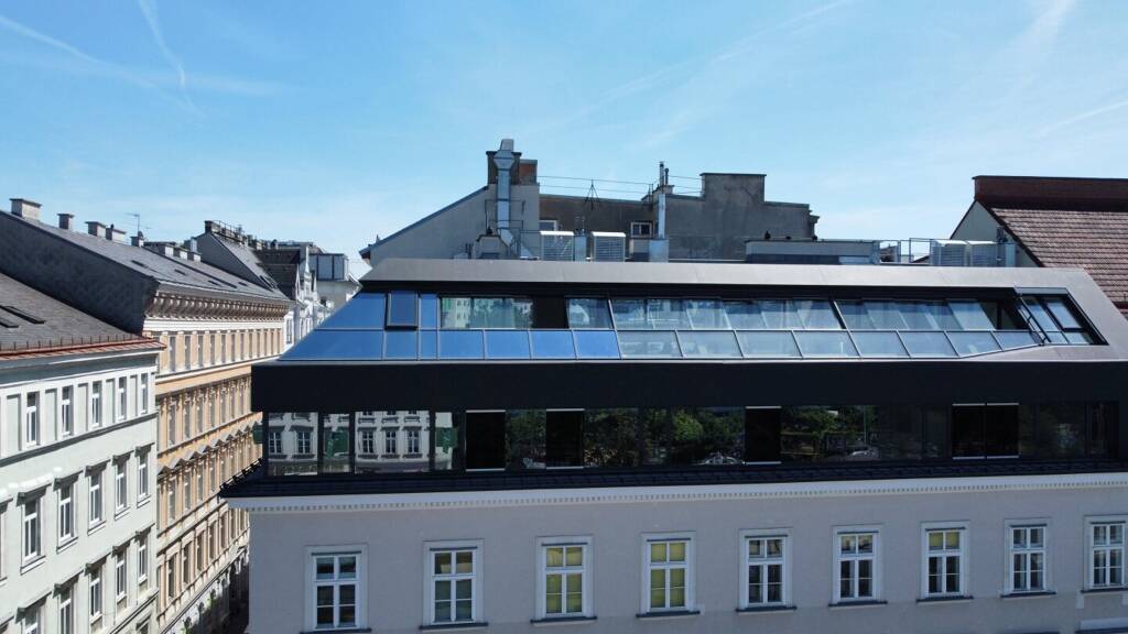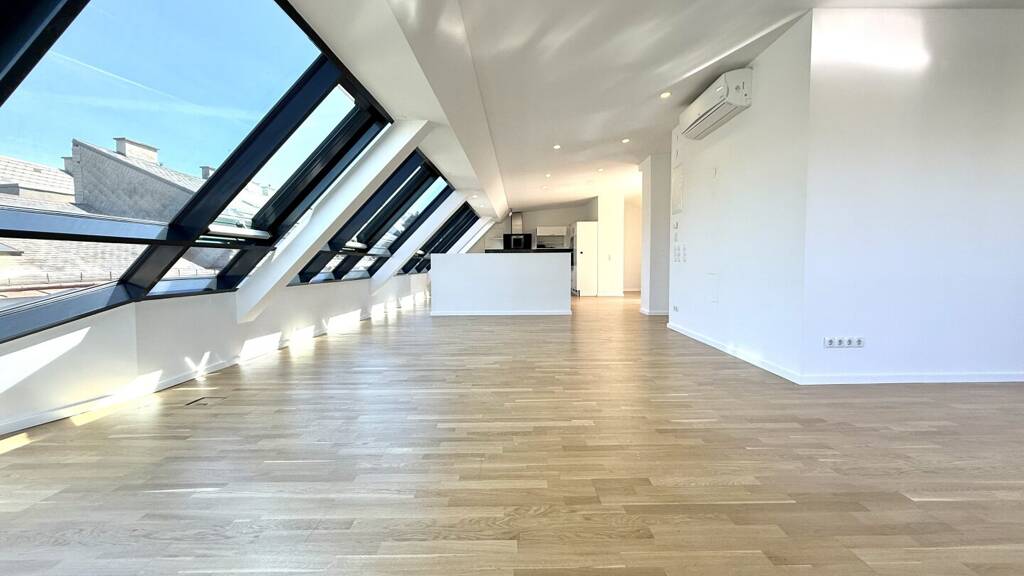 2. Dachgeschoß: Der eindrucksvolle Wohnsalon mit rund ca. 78?m² und dem traumhaften Fernblick über Wien sowie die ruhige ca. bildet das Herzstück der Wohnung. Der benachbarte Naschmarkt sorgt für kulinarische Erlebnisse mit Stil. Abends genießen Sie hier ein einzigartiges Panorama über das Lichtermeer der Stadt.
