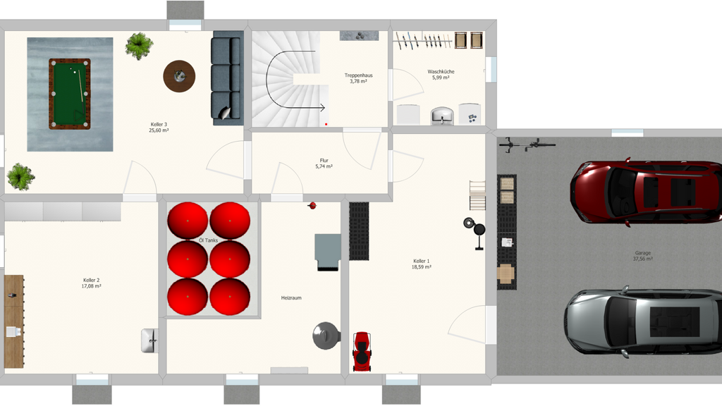 Der tagesbelichtete Keller erstreckt sich über die gesamte Grundfläche des Hauses und bietet umfangreichen Stauraum, einen praktischen Wäscheraum und direkten Zugang zur Doppelgarage.