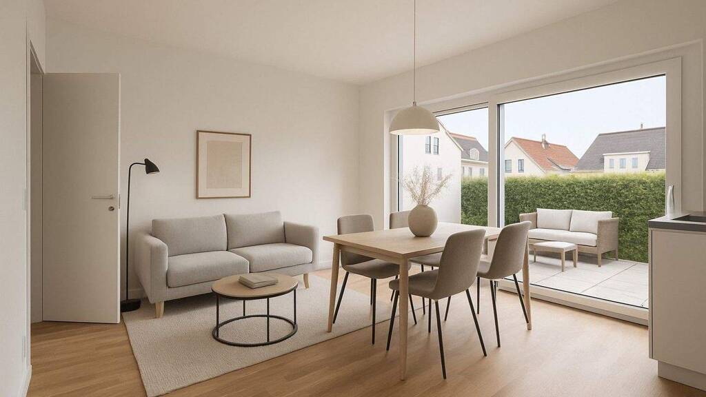 Der offen gestaltete Wohn- und Essbereich mit direktem Zugang zur eigenen Terrasse lädt zum Entspannen und Wohlfühlen ein - hier genießen Sie eine kleine Oase im Grünen.