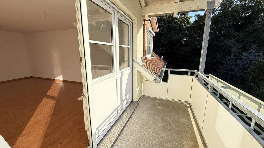 Der geräumige Wohnbereich bietet einen direkten Zugang zum großen Balkon mit einem schönen Blick ins Grüne - ein idealer Ort zum Entspannen und Genießen der naturnahen Umgebung.