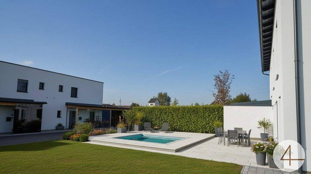 Der lichtdurchflutete Wohnbereich mit vorstehender Terrasse ist sehr großzügig gehalten und durch die üppigen Glasflächen können Sie stets den Ausblick in Ihren Garten genießen.