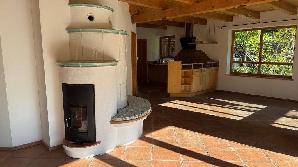 Wohnen im großen Stil……dann heißt Sie dieses außergewöhnliche Haus herzlich willkommen. Das hier vorgestellte Haus empfängt Sie mit einem durchdacht konzipierten Eingang und Garderobenbereich. Neben einem Zimmer welches sich sehr gut als Büro, Gäste oder Schlafzimmer eignet, steht Ihnen hier auch ein schönes Duschbad mit WC zur Verfügung. Kernstück dieses einmaligen Hauses ist der herrlich und äußerst hell gestaltete offene Wohn -Ess und Küchenbereich, von dem Ihnen auch möglich ist auf die vorgelagerte Bergblickterrasse herauszutreten. Ein echter Blickfang ist natürlich der sich herrlich in den Wohnbereich einfügende Kachelofen, der mehr als nur gelegentlich zum Verweilen einladen wird. Beim praktisch angelegten Küchenbereich bleibt zu erwähnen, dass dieser noch über eine separate Speisekammer verfügt. Über den imposanten Dielenbereich gelangen Sie in das Obergeschoss dieses großzügigen Hauses. Hier setzt sich die überaus interessante Konzeption dieses Haus natürlich fort. Ein fast schon zweiter offener und sehr heller Wohn oder Arbeitsbereich erwartet Sie hier und wie kann es anders sein …..natürlich auch mit einem gemütlich Wärmespenden Schwedenofen. Um diesen Bereich sind vier weitere Zimmer errichtet worden, wovon bei zwei Zimmern noch die Möglichkeit besteht auf eine Art verglaste Galerie zu gelangen, was allein schon ein Highlight für sich ist. Weiterhin haben zwei der Zimmer die Möglichkeit auf einen Balkon zu gelangen. Perfekt abgerundet wird diese Wohnebene durch ein großes Bad mit zwei Waschbecken, Badewanne und WC. Das Untergeschoss bietet aufgrund der kompletten Unterkellerung des Hauses auch noch einmal richtig viel Platz. Ein extra großer und hoher Kellerraum, der Heizungsraum und eine richtig geräumige Waschküche stehen Ihnen hier zur Verfügung. Komplettiert wird dieser Bereich des Hauses durch zwei klasse angelegte und vielseitig nutzbare Räume die das Wohnangebot und Platzangebot dieses interessanten Hauses ideal abrunden. Ein großzügiger Carport für zwei Autos und ein Gartenschuppen vervollständigen dieses großzügige Wohnangebot.