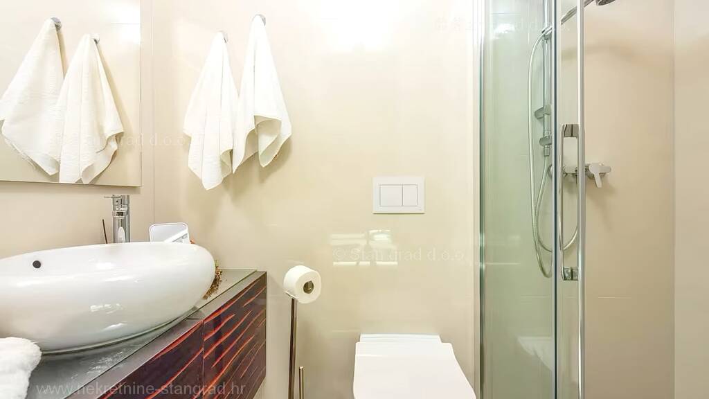 Im Immobilienangebot der Agentur Stan Grad Immobilien auf der Insel Krk gibt es eine sehr attraktive Wohnung, die sich perfekt für einen touristischen Aufenthalt und Urlaub an der Adria eignet. Diese Wohnung befindet sich in einer ausgezeichneten und selten verfügbaren Lage, direkt am Meer und in der Nähe des Zentrums von Malinska und der wichtigsten Annehmlichkeiten des Lebens. In Anbetracht der Art der Immobilie handelt es sich um eine geräumige einstöckige Wohnung. Im Inneren des wunderschön gebauten Gebäudes befindet sich die Wohnung im Erdgeschoss. Die Gesamtfläche dieser Wohnung beträgt 64 m2. Der oben genannte Bereich umfasst ein offenes Wohnzimmer und eine Küche mit Esszimmer, 2 Schlafzimmer, 2 Badezimmer, Toilette und Terrasse. Im äußerst gepflegten und luxuriös ausgestatteten Innenbereich des Objekts wurde ein reichhaltiger Gerätesatz der neuesten Generation verbaut. Zu beachten ist auch, dass zum Eigentum dieser Wohnung eine sehr schön gestaltete und raffinierte Gartenfläche von ca. 80 m2 gehört. Dem Eigentümer der Wohnung steht ein Parkplatz zur Verfügung. Darüber hinaus ist anzumerken, dass die Wohnung so ausgerichtet ist, dass sie einen schönen Blick auf die schöne Küstenlandschaft und die unmittelbare Umgebung der Siedlung bietet. Diese Wohnung ist Eigentum einer natürlichen Person, daher ist der Käufer verpflichtet, bei der Eigentumsübertragung auf seinen Namen eine Umsatzsteuer in Höhe von 3 % zu zahlen. Der Eigentümer der Immobilie garantiert die Ordnungsmäßigkeit der entsprechenden Eigentumsdokumente und die Möglichkeit eines schnellen Eigentumsübergangs der Wohnung auf den Käufer. Kontaktieren Sie uns und wir freuen uns, Sie in unserem Büro auf der Insel Krk begrüßen zu dürfen. Neben der Suche und Besichtigung der Immobilie unterstützt Sie der Makler Stan Grad Immobilien bei allen notwendigen Maßnahmen im Zusammenhang mit der Eigentumsübertragung und der Übernahme der Immobilie.