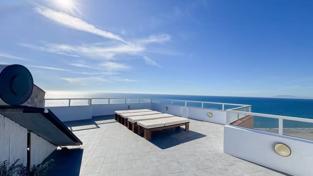 Zum Verkauf steht ein spektakuläres Penthouse, nur 75 Meter vom Strand entfernt, gelegen in einer privaten Wohnanlage mit gepflegten Gärten, Gemeinschaftspools und Tennisplätzen.