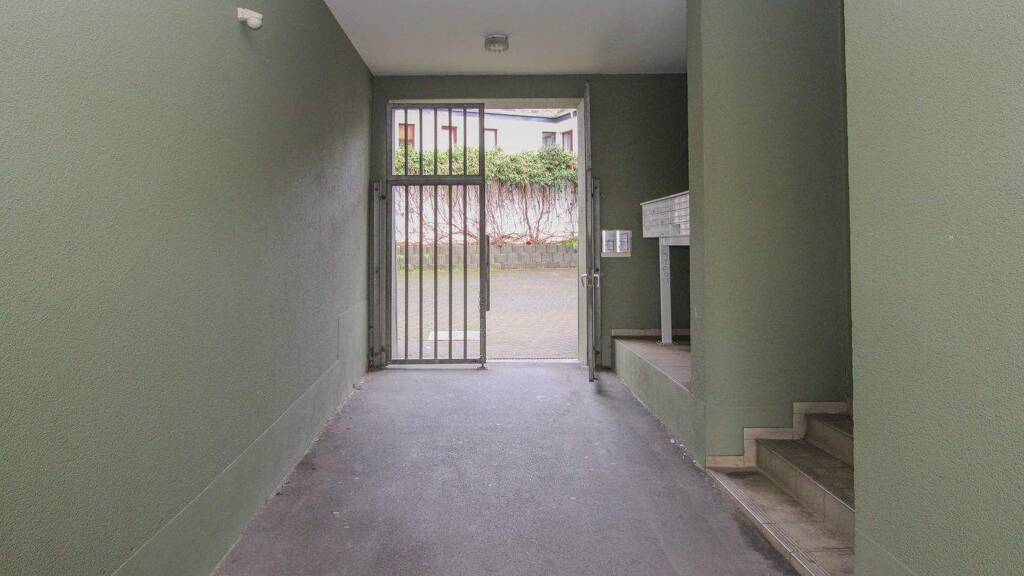 Ein Durchgang, im Erdgeschoss des Objektes, führt zu dem teilweise begrünten Hinterhof sowie zu den hofseitig angeordneten Hauseingängen.