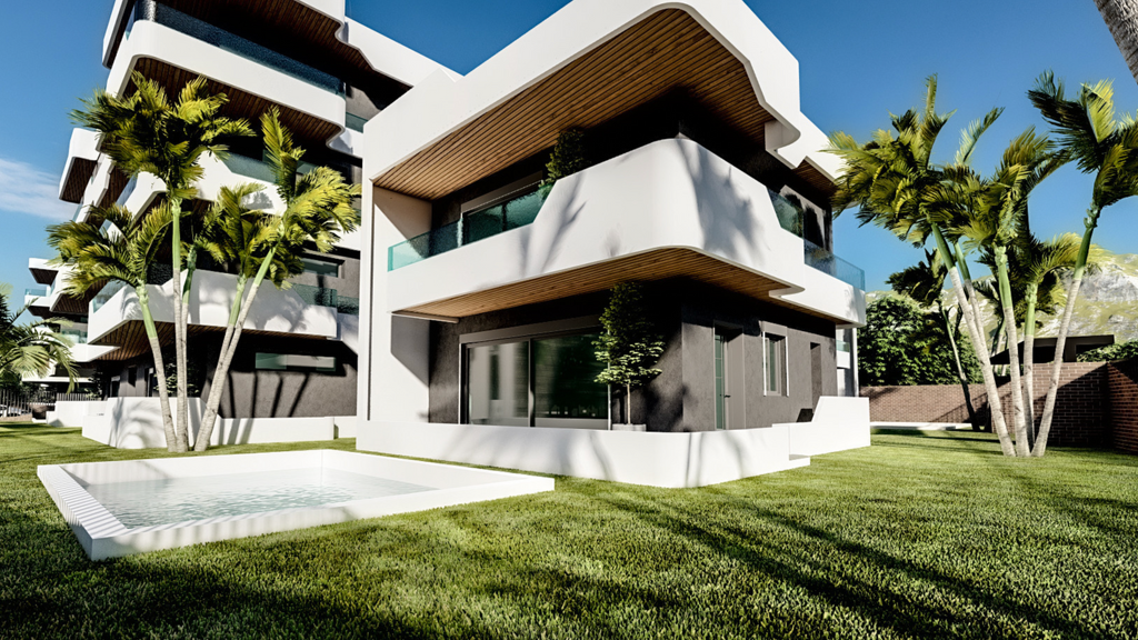 Er besteht aus 5 vierstöckigen Wohngebäuden mit 40 Wohnungen und 3 unabhängigen Maisonetten mit Swimmingpool. Die Wohnungen sind geräumig von etwa 122 bis 144 qm und verfügen über große Terrassen, die den Bewohnern eine schöne Aussicht und Privatsphäre bieten. Der Komplex verfügt über Aufzüge für einen einfachen Zugang zu den Etagen, die Komfort und Praktikabilität gewährleisten, während die geräumigen Innenräume eine hohe Wohnqualität garantieren.