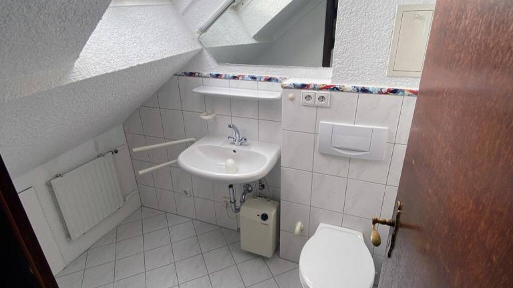 Die großzügig geschnittene Dachgeschosswohnung hat eine Wohnfläche von ca. 76 m² und ist aufgeteilt auf Diele, Schlafzimmer, Badezimmer mit Dusche, separates WC, Küche, Wohn-/Esszimmer, Zugang zur einmaligen, überdachten Dachterrasse mit toller Fernsicht. Ausstattung und Zustand der Wohnung sind gut. Die Böden sind mit Parkett und Fliesen belegt, die Fenster sind isolierverglast, die Beheizung erfolgt über eine Gas-Brennwertheizung mit Warmwasserversorgung. Besonders hervorzuheben sind die bis in den Dachfirst offenen und behaglichen Räume sowie die grandiose Fernsicht von der geschützten Dachterrasse aus.