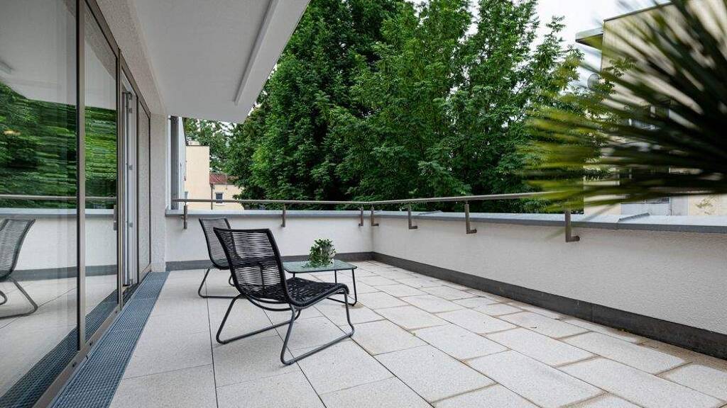 Der weitläufige Wohn-/Essbereich öffnet sich zu einer großzügigen Terrasse/Balkon mit rund 20 m². Zwei Schlafzimmer, ein elegantes Badezimmer mit Walk-in-Dusche und Badewanne, ein separates WC sowie ein Schrankflur sorgen für ein modernes Wohngefühl.