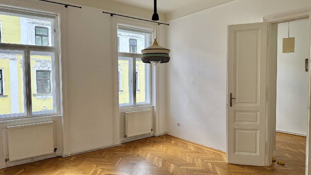 Das Herzstück der Wohnung bildet das großzügige Wohn- und Esszimmer mit Fischgrätparketten, das mit seinem klassischen Altbauflair zum Verweilen einlädt. Direkt angrenzend befindet sich das ruhige Schlafzimmer, das sowohl vom Wohnzimmer als auch vom Vorraum aus zugänglich ist ideal für flexible Wohnkonzepte.
