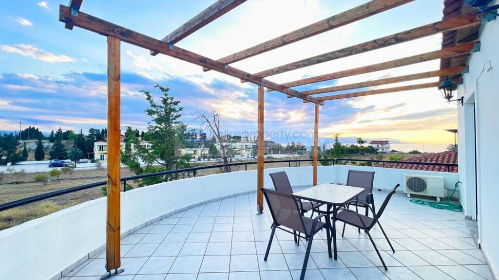 Einfamilienhaus mit Innentreppe ( =Maisonette - Haus ) mit ca. 200 qm Wohn-/Nutzfläche auf einem Grundstück von 350 qm. Es befindet sich in Loutraki Korinthia, nur 200 Meter vom Strand entfernt und mit Blick auf das Meer.