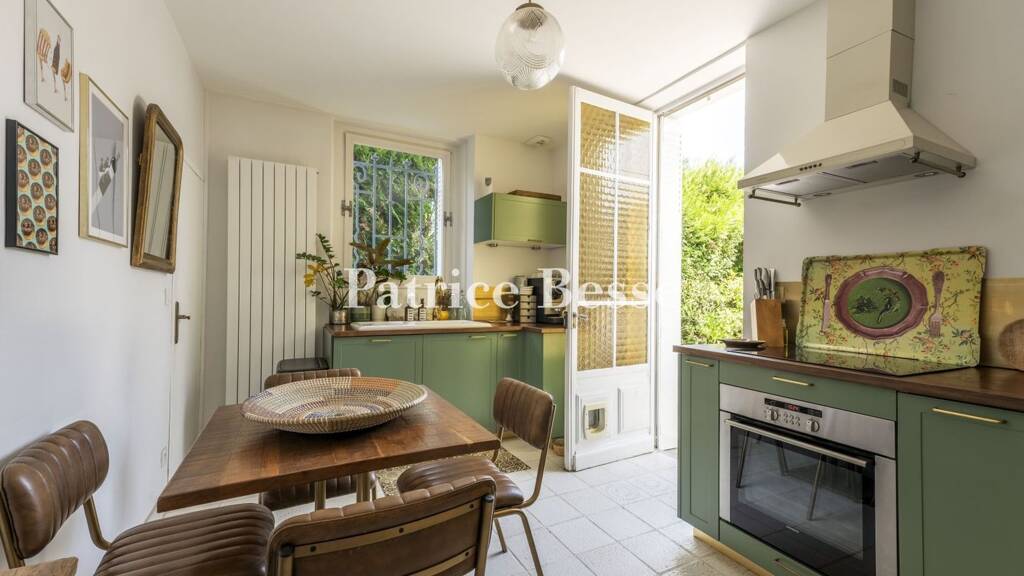 The hallway has a floor of parquet and mosaics. It connects to the rooms for everyday life, which include a lounge and a dining room. Old decorative features such as wooden panelling, mouldings, chevron parquet and a coffered ceiling have been preserved. A utility room, a lavatory, a kitchen that leads outside and a staircase that leads upstairs complete this ground floor.
