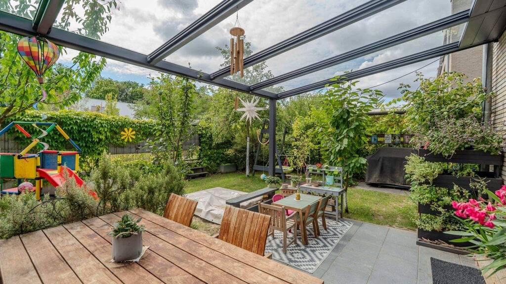 Der liebevoll angelegte Garten bietet eine geschützte, grüne Rückzugsoase. Die überdachte Terrasse mit integrierter Beschattung lädt zu gemütlichen Stunden im Freien ein. Besonders praktisch ist der direkte Zugang zur Garage, die zusätzlich über einen separaten Geräteraum verfügt und so weiteren Stauraum bietet.