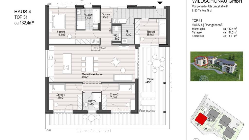 Anzahl der Badezimmer: 2, Anzahl der separaten WCs: 3, Anzahl Terrassen: 1, Balkon-Terrassen-Fläche: 44,00 m², Kellerfläche: 4,70 m², Bundesland: Tirol, 4 Etagen, Wohnungsnr.: Top 31