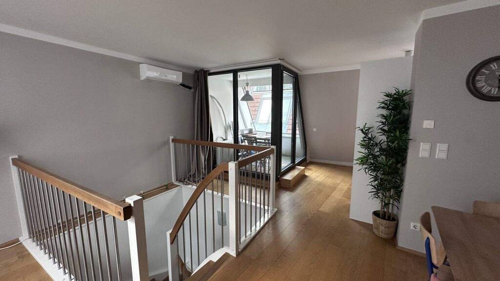 Die Treppen führen Sie in das großzügige Wohnzimmer mit einer abgegrenzten Wohnküche und ebenso auf den etwa 4 m² großen Balkon!