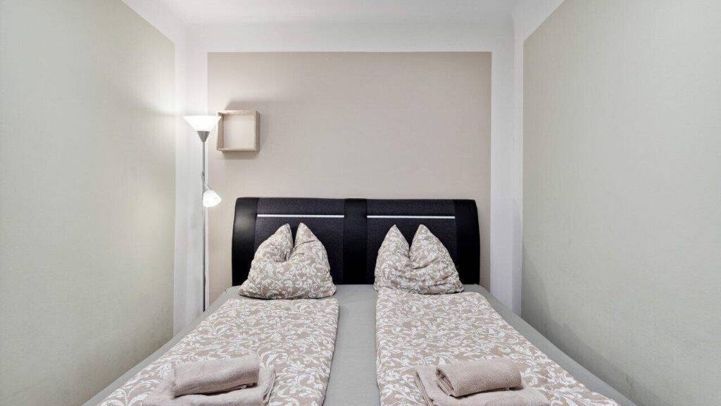Nach links dem Flur entlang, gelangen Sie in das mit einer Badewanne, einem Waschbecken und einem Waschmaschinenanschluss ausgestattete Badezimmer. Außerdem führt Sie der Gang in beide der zwei separaten Schlafzimmer.