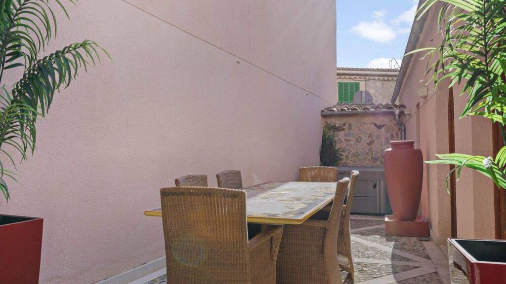 Im Erdgeschoss befindet sich ein großzügiger Wohn- und Essbereich mit Kamin, eine separate Küche mit SMEG-Geräten sowie ein Master-Schlafzimmer mit Bad en suite, Badewanne und Fußbodenheizung. Der private Innenhof mit überdachter Terrasse und Jacuzzi schafft eine geschützte Wohlfühloase und führt zu weiteren Nebenräumen wie Hauswirtschaft, Technik und Abstellflächen. Eine große Garage für ein Fahrzeug ist im Ortskern ein besonderes Highlight.