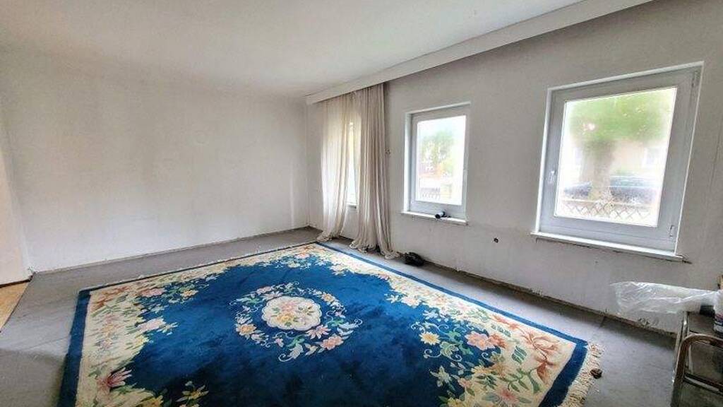 Man betritt das Gebäude von der Straßenseite hin zur geräumigen Diele; ein Vordach schützt den Eingangsbereich. Von hier aus sind die einzelnen Räumlichkeiten im Erdgeschoss begehbar, sowie das Obergeschoss und der Keller. Rechtsseitig vom Eingang liegen zwei Zimmer, welche offen miteinander verbunden sind sowie die Küche. Der Anbau aus dem Jahr 1960 auf der linken Seite beinhaltet ein weiteres Wohnzimmer; hier schaffen große Fensterflächen eine helle und freundliche Wohnatmosphäre. Direkt vom Wohnzimmer aus ist die nach Südwesten ausgerichtete Terrasse zu betreten. Über eine Massivholztreppe von der Diele aus gelangt man zum Obergeschoss. Zwei weitere Zimmer sowie das Bad befinden sich auf dieser Ebene. Nach 1990 wurden die Dacheindeckung und die Fenster erneuert. Ansonsten besteht sehr hoher Sanierungsbedarf; die Gaszentralheizung aus dem Jahre 1992 kann nicht mehr in Betrieb genommen werden. Medienanschlüsse wie Strom, Wasser, Kanalisation und Erdgas sind vorhanden, zum Fernsehempfang steht eine Sat-Anlage zur Verfügung. Für den hinteren Teil des Grundstücks wird auf der rechten Seite ein 3 Meter breites Geh- Fahr- und Leitungsrecht vereinbart. Bei Bedarf kann dieses Grundstück mit 400 m² Größe zusätzlich erworben werden.