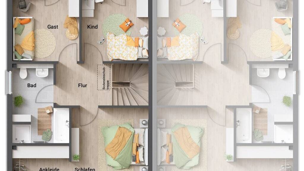 Die Doppelhaushälften haben eine Wohnfläche von je ca. 124 m2 und sind schlüsselfertig ausgeführt ohne Innenmalerarbeiten und Bodenbeläge