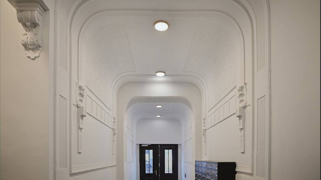Neue Holzfenster in klassischer Altbau-Optik, 3-fach verglast. Eingangstüre 90x220 cm Sicherheitsklasse RC3 mit Sicherheitsbeschlägen.