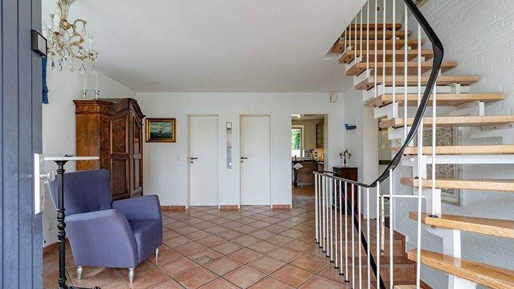 Dieses charmante, freistehende Haus bietet auf 155 m² viel Raum zum Wohlfühlen und Entspannen. Der großzügige Eingangsbereich heißt Sie willkommen und führt Sie in das lichtdurchflutete Wohnzimmer mit Kamin, das mit seiner großen Fensterfront und dem direkten Zugang zur sonnigen Terrasse das Herzstück des Hauses bildet. Hier genießen Sie ungestörte Momente im Grünen, umgeben von einem gepflegten, eingewachsenen Garten.