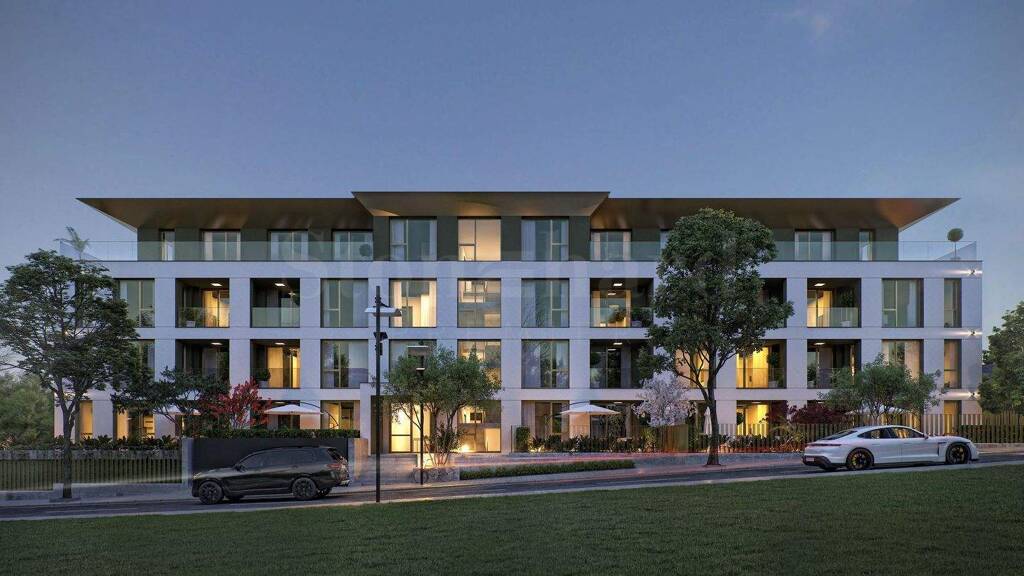 Die Fassadengestaltung und die verwendeten Materialien vereinen helle und dunkle Töne und erzeugen so ein elegantes und klares Erscheinungsbild. Hauptbestandteil ist ein leichter Mineralputz, der dem Gebäude Leichtigkeit und Luftigkeit verleiht, während bronzene Akzente an den Fenstern und grüne Details Tiefe und Kontrast schaffen. Die Glasgeländer auf den Terrassen sorgen für Modernität und Transparenz und betonen die Verbindung zwischen Innen- und Außenraum. Großflächige Fenster (französischer Typ) verstärken diesen Effekt zusätzlich und lassen Innen und Außen ineinander übergehen. Die Dachkonstruktion verleiht der Silhouette Dynamik und Charakter und schützt gleichzeitig die Terrassen.
