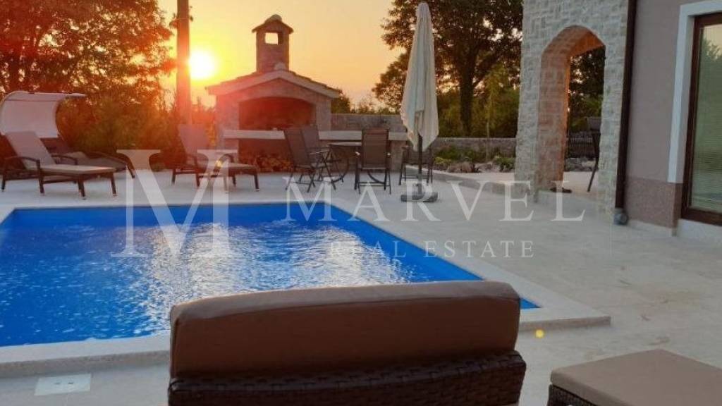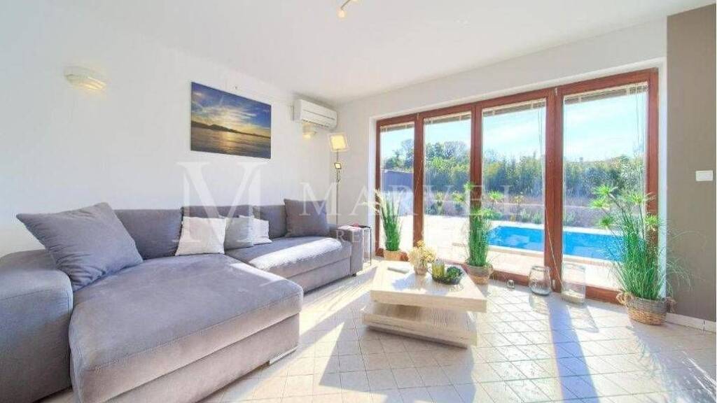 Haus mit Pool in ruhiger Lage, Insel Krk, Nähe Malinska Ideal für Familie oder Investition! Zum Verkauf steht ein vollständig möbliertes Einfamilienhaus mit Pool auf der Insel Krk, in der Nähe von Malinska. Diese Immobilie eignet sich sowohl für eine Familie als auch als Investition zur Vermietung, da sie für die Vermietung registriert ist und bereits seit mehreren Jahren erfolgreich Einkommen erzielt. Mit einer Wohnfläche von 158 m und einem Grundstück von etwa 400 m bietet dieses Haus komfortables Wohnen in einer ruhigen Umgebung. Das Haus besteht aus Erdgeschoss und ersten Stock. Im Erdgeschoss befinden sich ein Badezimmer, ein Schlafzimmer, Abstellraum, Küche mit Essbereich und ein Wohnzimmer mit Kamin. Vom Erdgeschoss gelangt man in den gepflasterten Garten und auf die überdachten Terrassen, die ideal zum Entspannen im Freien sind. Ein Stein-Grill im Garten ermöglicht gemütliche Sommerabende mit Familie und Freunden. Auf dem Grundstück stehen drei Parkplätze zur Verfügung. Im ersten Stock befinden sich zwei Schlafzimmer und ein Badezimmer. Ein Schlafzimmer hat Zugang zu einem Balkon mit Meerblick. Das Haus ist vollständig möbliert, mit Sat-TV, Internet, Inverter-Klimaanlagen und ist einzugsbereit. Dieses Haus auf der Insel Krk ist eine ausgezeichnete Wahl für Investoren, da es seit Jahren erfolgreich als Vermietungsobjekt genutzt wird. Aufgrund seiner ruhigen Lage und guten Anbindung an beliebte Ziele auf Krk ist es eine perfekte Wahl für diejenigen, die Ruhe genießen möchten und trotzdem in der Nähe aller Annehmlichkeiten sind.