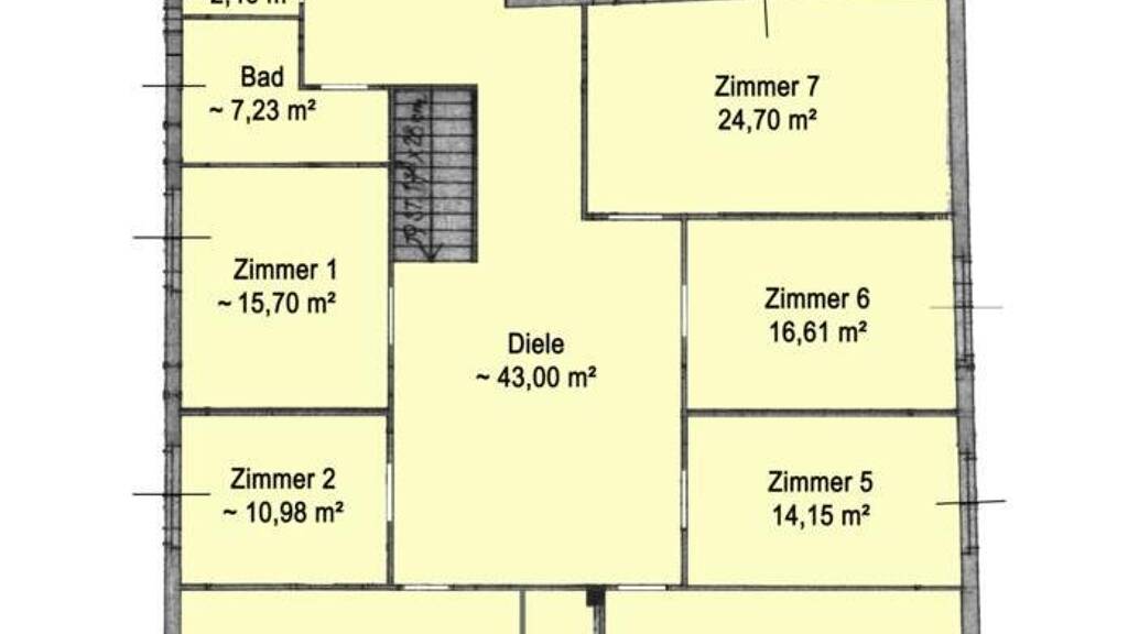 Die Wohnung verteilt sich auf das Erdgeschoß und den 1. Stock. Je ein Eingang führt straßenseitig bzw. vom kleinen Innenhof in die geräumige Diele im Erdgeschoß. Eine Holztreppe führt in die zentrale Diele im 1. Stock. Auf dieser Ebene stehen fast 200 m² Wohnfläche zur Verfügung.