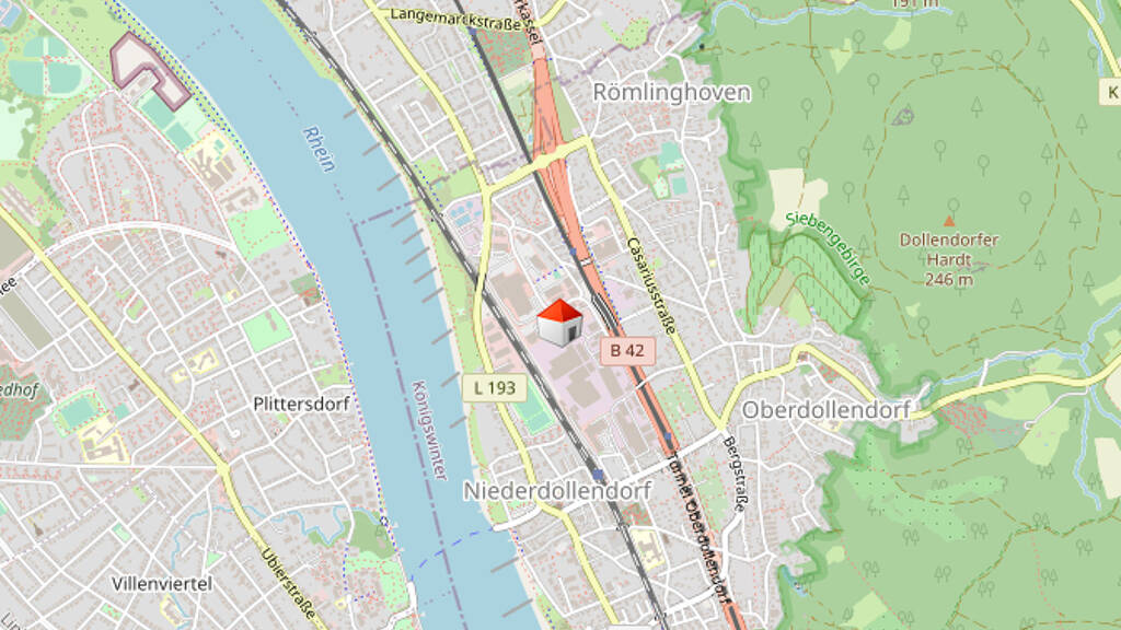 Gewerbegebiet Im Mühlenbruch in Königswinter - Niederdollendorf. Unmittelbar an der Ortsgrenze zu Bonn-Oberkassel, direkte Autobahnanbindung zur B42. Öffentliche Verkehrsmittel sind fußläufig erreichbar. Neben einer Tankstelle, einem Baumarkt und diverser Einzelhandelsflächen gibt es in diesem Gewerbegebiet moderne Büro- und Ärztehäuser.
