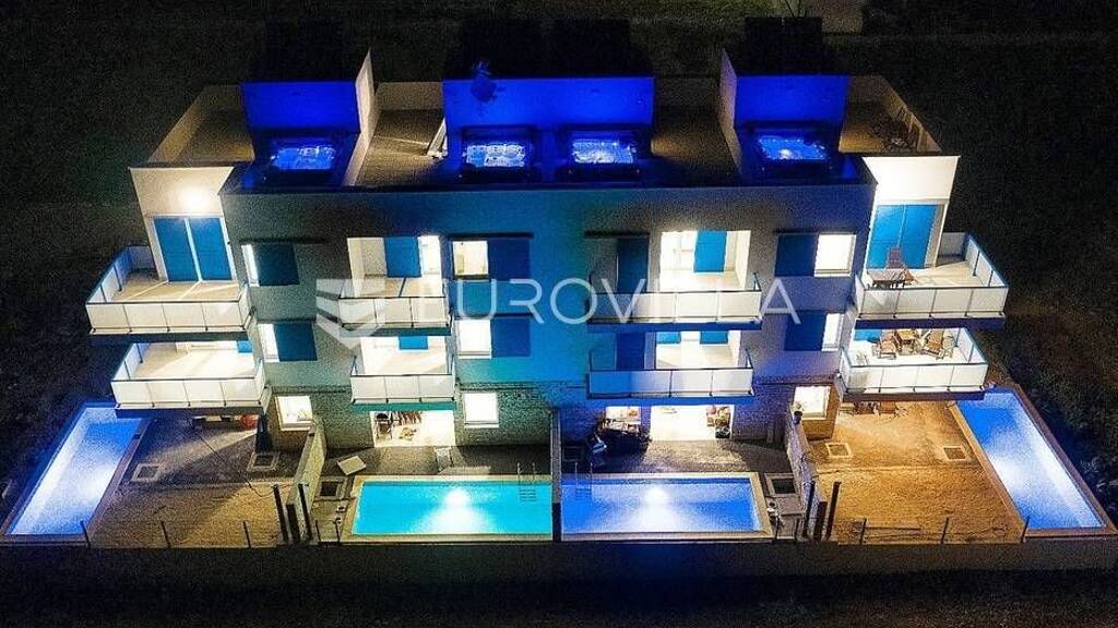 Moderno i prvoklasno opremljena villa u nizu s bazenom i pogledom na more i otoke nalazi se u mjestu Privlaka, svega 200m od mora i prekrasne pjescane plaze. Objekt graden i projektiran prema najvisim standardima na parceli povrsine 700m2.Zgrada se sastoji od 4 ville, svaka stambena jedinica ima svoj ulaz i vertikalnu komunikaciju unutar stambene jedinice, a slaganjem pravilnih pravokutnih oblika u skladnu cjelinu s elementima mediteranskog uredenja nastoji se zgrada uklopiti u okruzenje.Villa C povrsine 289,35m2 upotpunosti je namjestena te se sastoji od prizemlja, 1.kata, 2.kata te krovne terase sa jacuzzijem. Prizemlje se sastoji od open-space kuhinje s blagovaonicom i dnevnim boravkom, terase s bazenom, ulaznog prostora, izbe, zahoda. Moderno stubiste vodi na 1. kat na kojem se nalaze 3 spavace sobe, hodnik, 2 kupaonice, balkon i loda. 2.kat se sastoji od 3 spavace sobe, hodnika, kupaonice, balkona i lode. Krovna terasa je povrsine 45m2 i posjeduje jaccuzi te sjedecu garnituru. Villa posjeduje i 3 parkirna mjesta.Vrhunska lokacija, u mirnom dijelu Privlake, udaljena 20min voznje do grada Zadra, i 5min do grada Nina.Ostale informacije na upit.... Vise na eurovilla.hr, ID: 483128