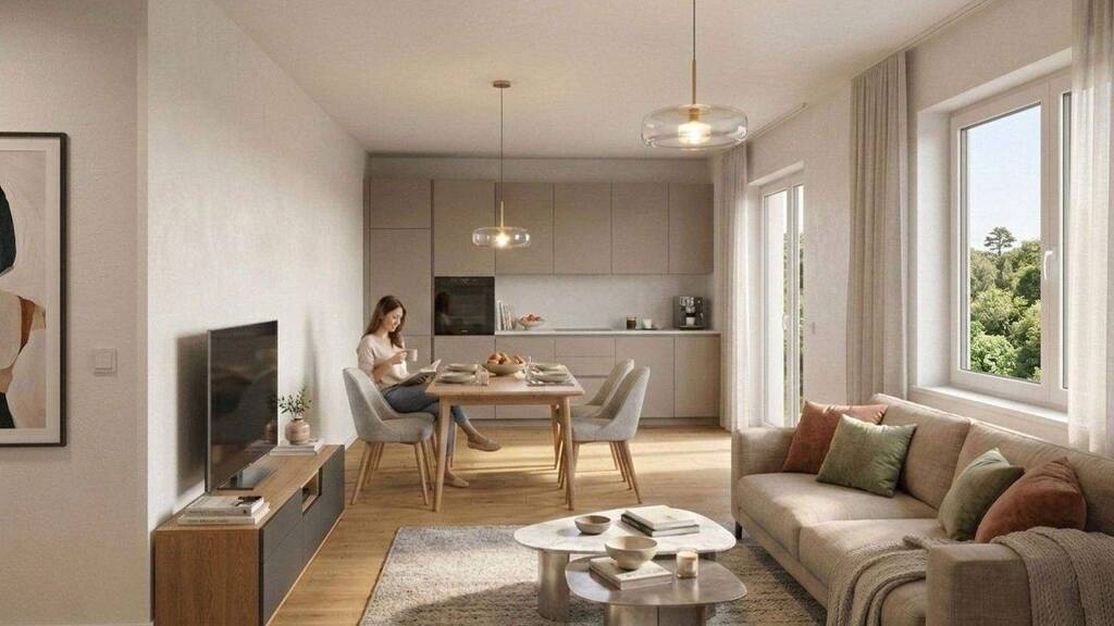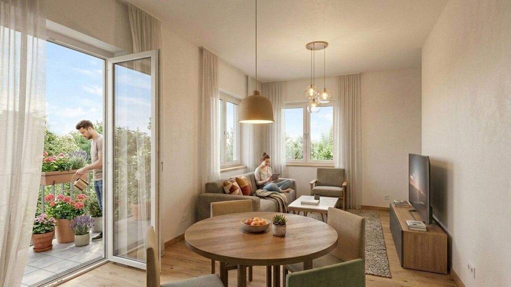Der Mittelpunkt der Wohnung ist der offene Wohn-/Essbereich. Durch seine helle, freundliche Gestaltung eignet er sich ideal zum Kochen, Essen und Entspannen - ob gemeinsames Abendessen, gemütlicher Feierabend auf dem Sofa oder Besuch von Freunden. Von hier aus geht es direkt auf den Balkon, der sich als kleiner Rückzugsort im Alltag anbietet: für den Kaffee am Morgen, frische Luft zwischendurch oder den Tagesausklang am Abend.