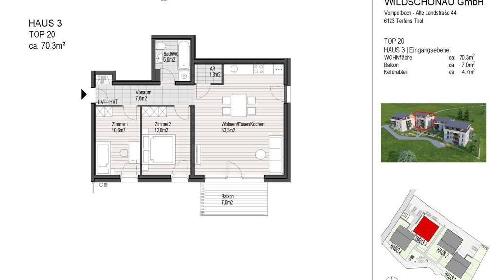 Anzahl Balkone: 1, Balkon-Terrassen-Fläche: 7,00 m², Kellerfläche: 4,70 m², Bundesland: Tirol, 4 Etagen, Wohnungsnr.: Top 20