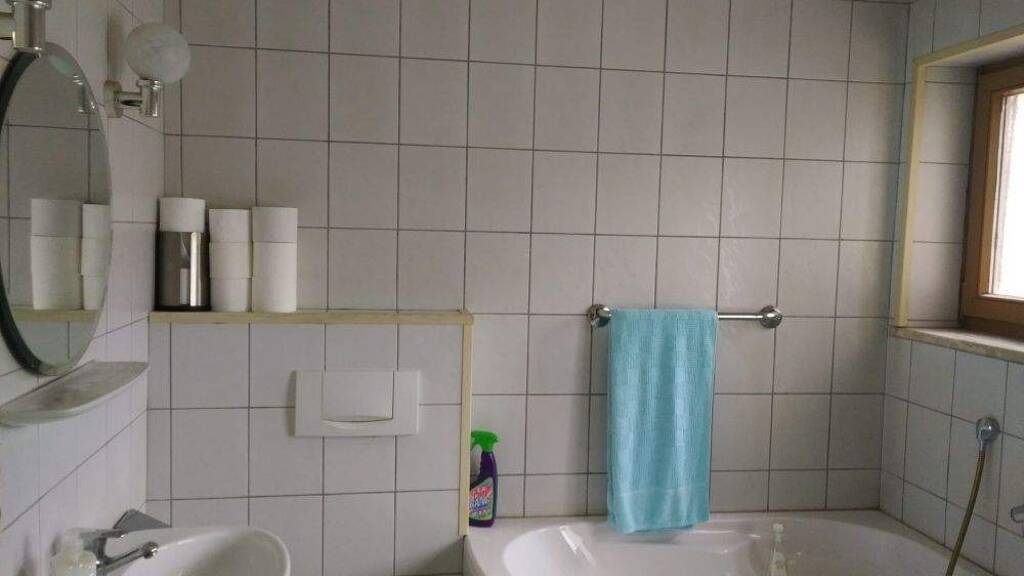 Das Badezimmer ist mit einer Eckbadewanne, WC, Waschtisch und einer Dusche ausgestattet. Ein Fenster sorgt für schönes Tageslicht und ausreichend Belüftung.