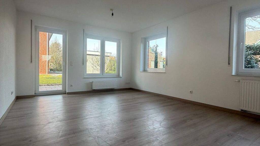 Die 60 m² grosse Erdgeschosswohnung befindet sich im ersten Stock eines zweistöckigen Backsteingebäudes in der Hauptstraße 27801 Neerstedt. Die Wohnung verfügt über zwei Zimmer, darunter ein Schlafzimmer und ein helles Wohnzimmer mit Zugang zur Terrasse und dem Garten. Ein modernes Badezimmer mit Badewanne und Dusche sowie eine helle Küche mit grossem Fenster runden das Raumangebot ab.