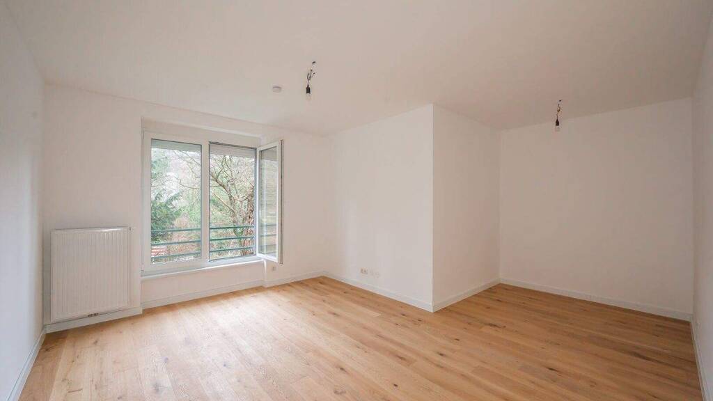 The apartment is located in Bujattigasse, 1140 Vienna, a tranquil and green area known for its idyllic surroundings, including a nearby stream and lush greenery.