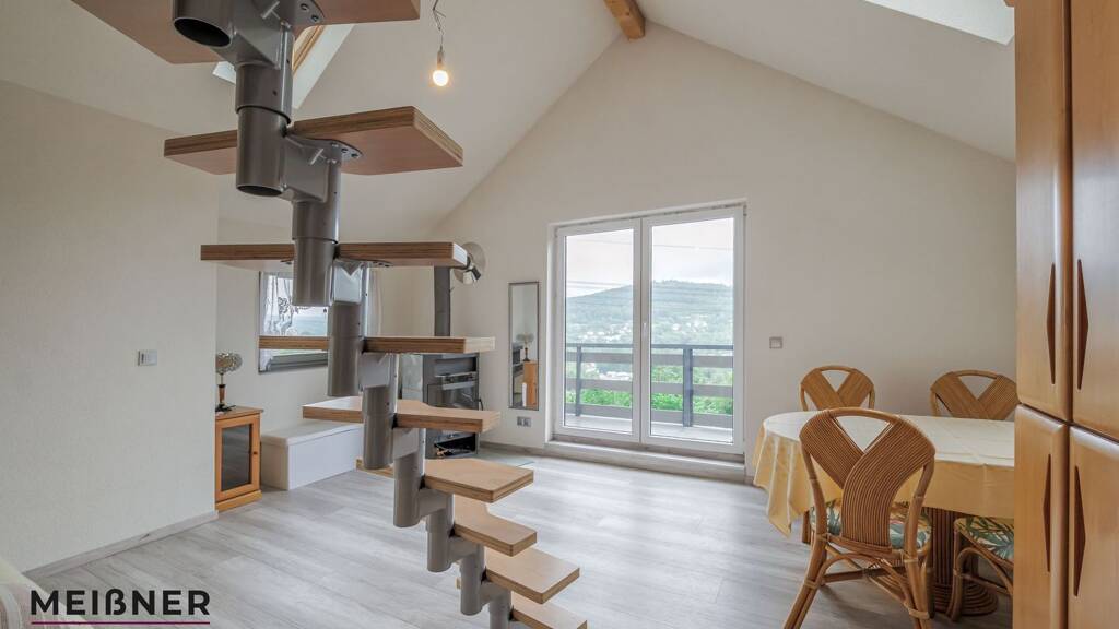 Das Herzstück bildet der großzügige Wohn- und Essbereich, der dank großer Fensterflächen und einem großzügigen Balkon einen weiten Blick über Suhl eröffnet. Ein Holzofenkamin sorgt für gemütliche Abende und unterstreicht den besonderen Wohlfühlcharakter. Über eine Treppe gelangt man in das Dachgeschoss, wo ein separater Schlafraum Rückzug und Erholung garantiert.