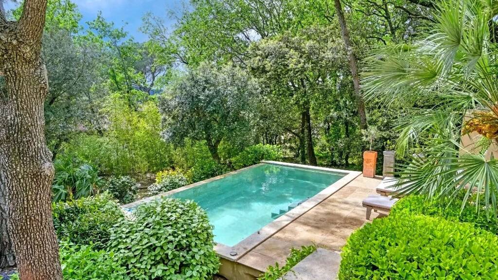 The entrance invites you to push open an old Balinese door that opens onto an elegant living room dressed in very chic blue and black marble and wallpapers in bright and warm colors. But already your gaze escapes beyond the sliding bay window where the green and blue horizon stretches to the Camp de Cesar belvedere. This remarkable landscape can also be contemplated from the teak terrace at any time of day and throughout the seasons for your greatest pleasure. From the very cosy living room, after going down a few steps, you will discover the eat-in kitchen entirely clad in wood and Bahia granite. It invites you to share a meal inside, or outside on the terrace with its breathtaking view. You will enjoy a peaceful wooded garden, where a travertine infinity pool can be seen behind lush vegetation.