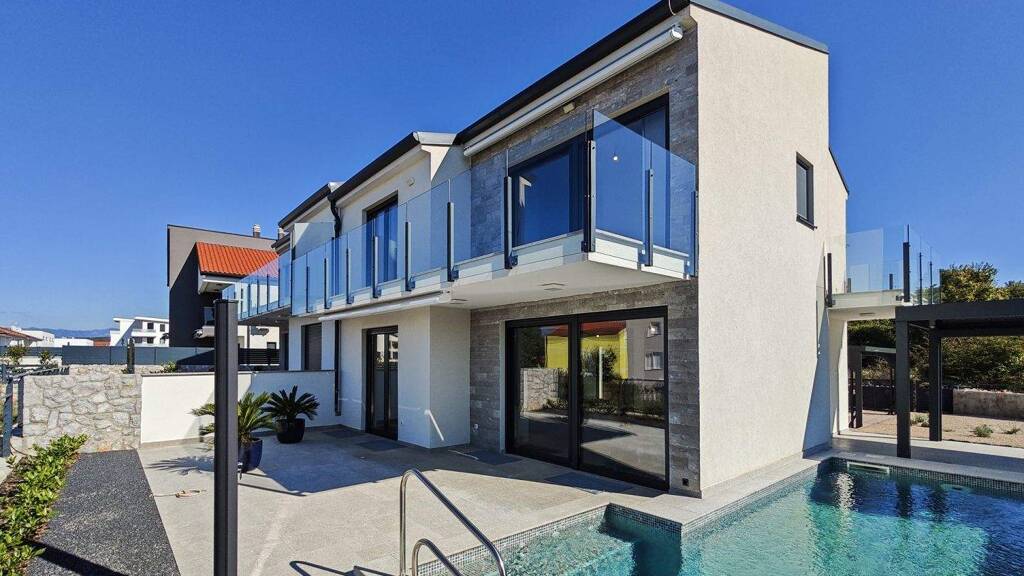 In ruhiger Lage in Malinska, nur wenige Gehminuten vom Meer und allen Annehmlichkeiten entfernt, befindet sich diese elegante Doppelhaushälfte, die erstklassige Architektur, luxuriöse Ausstattung und ein tadellos dekoriertes Äußeres mit Panoramablick auf das Meer und die Küste kombiniert. Die gesamte Innenfläche beträgt 184 m², verteilt auf drei Etagen, die so konzipiert sind, dass sie den Anforderungen eines modernen Lebensstils mit absoluter Privatsphäre und Komfort gerecht werden. Im Untergeschoss befindet sich ein Multifunktionsbereich mit einer Taverne, einem Gesellschaftsraum und einer zusätzlichen Küche, während die Waschküche, der Lager- und der Technikbereich diskret in die Innenarchitektur integriert sind. Das Erdgeschoss wird von einem offenen Wohnbereich dominiert, der das elegante Wohnzimmer mit einer Designerküche und einem Esszimmer verbindet. Zwei geräumige Terrassen im Erdgeschoss mit einer Gesamtfläche von 40 m² erweitern den Wohnraum nach außen, sodass Sie zu jeder Tageszeit die Aussicht und die Düfte des Mittelmeers genießen können. Eine zusätzliche 21,6 m² große Terrasse unter einer bioklimatischen Pergola mit Zugang von der Küche schafft das perfekte Ambiente für Mahlzeiten im Freien. Im Obergeschoss befinden sich drei luxuriös eingerichtete Schlafzimmer, jedes mit eigenem Bad und Zugang zu einem Balkon mit einer Gesamtfläche von 18 m². Jeder Ausblick von diesem Stockwerk ist atemberaubend und schafft eine ideale Kombination aus Intimität und Prestige. Die Villa ist mit den modernsten Systemen ausgestattet: Fußbodenheizung, Wärmepumpe, Klimaanlage und ALU-Tischlerei mit Rollläden garantieren höchste Energieeffizienz und Komfort das ganze Jahr über. Eine bioklimatische Pergola betont die Raffinesse des Außenbereichs zusätzlich. Der angelegte Garten mit 312 m² bietet ein Gefühl absoluter Privatsphäre. Der Swimmingpool mit einer Wasseroberfläche von 27 m² ist mit einem Wasserelektrolysesystem, Chlorinator, Gegenstromschwimmpumpe und Massagedüsen ausgestattet - perfekt zum Entspannen und Erholen. Ein Sonnendeck am Pool und zwei überdachte Parkplätze (25 m²) runden die Funktionalität und Ästhetik des Außenbereichs ab. Die Lage ist perfekt ausgewogen, nah genug am Meer, aber abgeschieden genug, um die Ruhe und Aussicht in vollen Zügen zu genießen. Diese Villa bietet die perfekte Kombination aus modernem Luxus, natürlicher Umgebung und zeitlosem Meerblick. Eine Gelegenheit, die Sie sich nicht entgehen lassen sollten. Kontaktieren Sie uns für eine private Besichtigung.