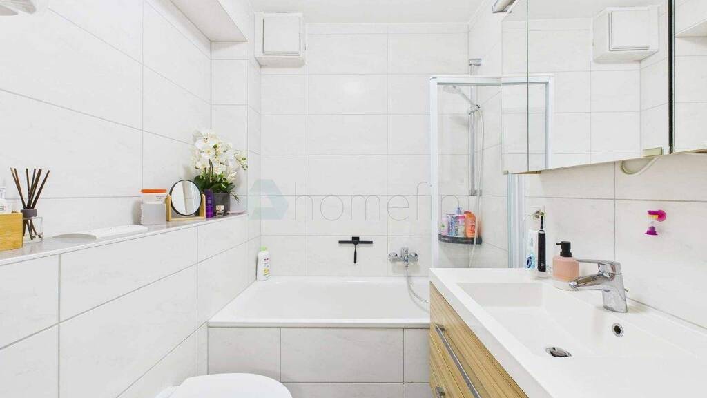 Das Badezimmer präsentiert sich modern und ästhetisch mit großen weißen Wand- und grauen Bodenfliesen.