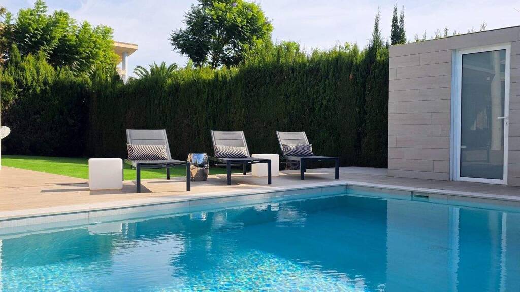 - Moderner, nicht chlorierter Salzwasser-POOL mit eingebauter Treppe und Solarium, umgeben von einem gepflegten Garten und großen Terrassen. Es verfügt über einen Umkleideraum mit einem komplett ausgestatteten Badezimmer mit Klimaanlage, eine Außendusche neben dem Pool sowie einen praktischen Maschinenraum mit Luftreiniger und Platz für Wartungswerkzeuge.