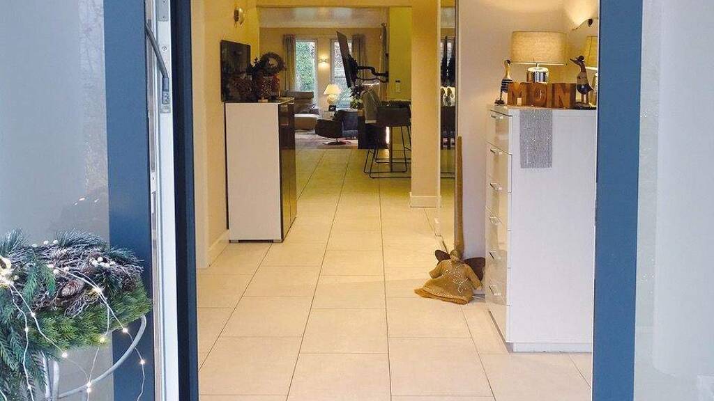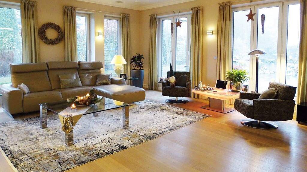 Wenn man sich dem Grundstück von der Straße her nähert, empfängt einen zuerst der einladende Besucherparkplatz. Darüber thront sie erhöht, die Villa: gradlinig, aufgeräumt, souverän und vollverklinkert. Fast ein wenig Understatement. Ein Wolf im Schafspelz? Wenige Stufen sind es bis zur massiven Eingangstür. Der helle Flur ist einladend. Nur wenige Schritte – und man wird magisch angezogen vom Ambiente des lichtdurchfluteten Wohn-/Essbereichs mit 82 m² Lebens(t)raum. Die Ausstattung der angrenzenden, offenen 14 m² Küche mit Kochinsel und hochwertigen Markengeräten verrät: hier könnten Köstlichkeiten mit französischen Anklängen entstehen. Vielleicht Richtung Sterne-Niveau? Aber dazu kommen wir etwas später. War hier einer der führenden europäischen Innenarchitekten am Werk und hatte völlige Gestaltungsfreiheit? Nein! Die Createure waren die Verkäufer selbst. Sie planten und erschufen diesen mondänen Wohntraum vor rund 12 Jahren in monatelanger Detailarbeit für sich selbst. Und es kommt noch besser: Wem Ausstattung und Interieur gefallen, der kann sie für einen überschaubaren Preis komplett dazu erwerben – für deutlich weniger, als so mancher in die Sonderausstattung seines luxuriösen Autos steckt. Auspacken – Einräumen – Einziehen. So einfach könnte Ihr Wohnerlebnis beginnen. Apropos Auto: manche Ausstattungs-Details lesen sich fast wie Angaben aus einer Verkaufsanzeige für eine Oberklassen-Limousine: Baujahr 2013, aus erster Hand, komplette Dokumentation. Einbruch-Meldesystem, „Keyless-Go“ (Zugangskontrolle per Fingerprint). Ambiente-Beleuchtung, Soundsystem und Klimatisierung raumweise per Touchscreen steuerbar. Topzustand: eine glatte Eins. Die großzügige Terrasse mit elektrisch steuerbarer Beschattung schreit förmlich nach BBQ-Events mit Freunden. Oder zum Sonnenbad zu zweit. Der Pflegeaufwand der Außenanlage ist beherrschbar, auch dank des Mähroboters. Der geräumige Carport mit Wallbox für E-Fahrzeuge ergänzte erst 2022 das Gesamterscheinungsbild.