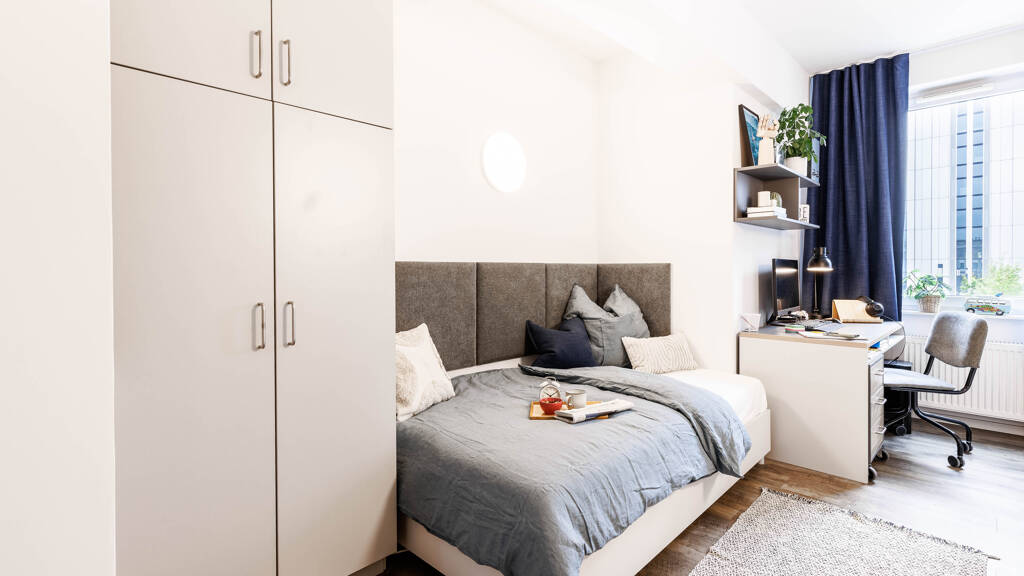 DEIN VOLL MÖBLIERTES APARTMENT •Wohn- und Arbeitsbereich: Bett inkl. Matratze, Schreibtisch mit Stuhl, Garderobe mit Spiegel, lichtdichte Vorhänge, Modulair Rail System inklusive Pinboard, Gegensprechanlage und generell extra viel Stauraum