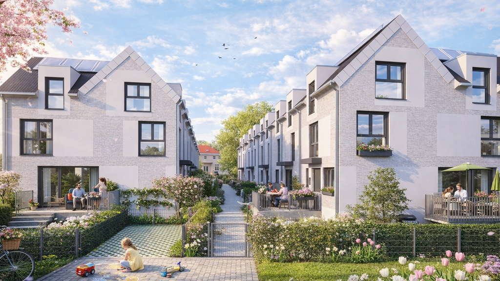 Highlights. . 2 Reihen mit je 5 Townhouses . 5-7 Zimmer auf 3 - 4 Ebenen . ca. 110 - 141 m² Wohnfläche . Moderne Architektur . Nachhaltige Energiestandards . Alle Häuser mit Gartenanteil, Terrasse/Balkon