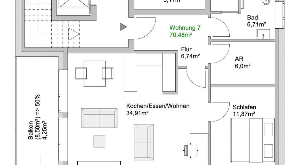 Mit dem Aufzug gelangen Sie bequem in das erste Obergeschoss, in dem sich Ihre neue Wohnung befindet. Die ca. 68 m² verteilen sich auf ein Schlafzimmer, ein Tageslicht-Bad, einen offener Wohn- und Essbereich, eine Küche und einen praktischen Abstellraum. Abgerundet wird das Wohnungsangebot durch den Balkon, der zum Entspannen im freien einlädt.