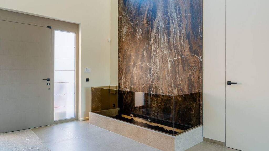 Der im Jahr 2023 fertiggestellte Neubau bietet auf ca. 428 m² Wohnfläche ein Ambiente, das durch Großzügigkeit, Licht und klare Linien geprägt ist. Bereits beim Betreten öffnet sich ein eindrucksvolles Entrée mit einer Raumhöhe von bis zu 6,60 Metern, in dem ein integrierter Wasserfall als architektonisches Highlight die besondere Atmosphäre des Hauses widerspiegelt. Das gesamte Erdgeschoss ist mit edlen Marazzi-Marmorfliesen ausgestattet, die den offenen Wohn- und Kochbereich perfekt in Szene setzen.