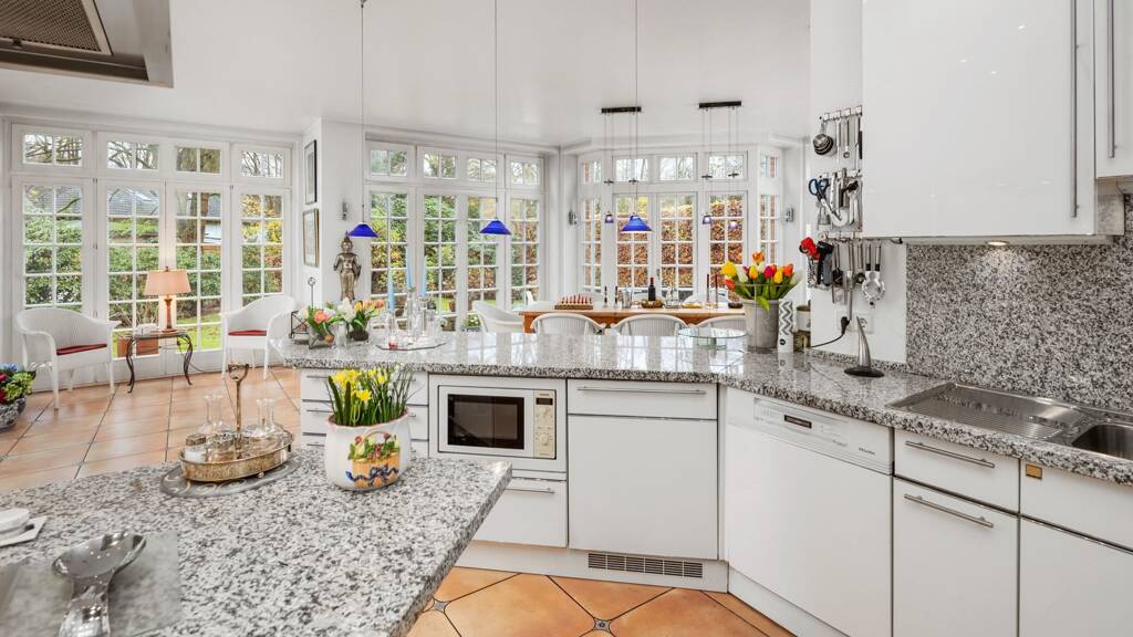 Insgesamt ca. 335 m² Wohnfläche (zuzüglich ca. 22 m² im wohnlich genutzten Spitzboden) verteilt auf neun Zimmer und drei Wohnebenen bieten eine besondere Wohlfühlatmosphäre sowie ausreichend Raum für die ganze Familie. Die Ausstattung wird höchsten Wohnansprüchen gerecht.