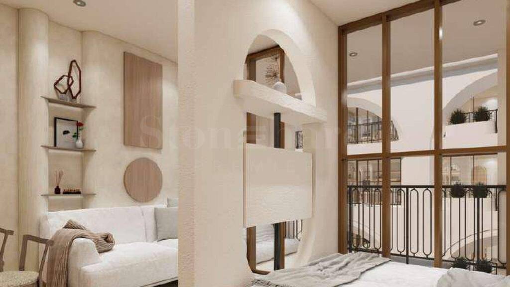 Die von uns ausgewählte Wohnung, die wir Ihnen vorstellen möchten, hat eine Fläche von 40 m² und befindet sich im zweiten Stock eines dreistöckigen Gebäudes. Sie umfasst ein gemütliches Wohnzimmer mit Kochnische und Bartheke, ein separates Schlafzimmer sowie eine großzügige Sonnenterrasse mit privatem Pool zur Entspannung und zum Vergnügen der Bewohner.