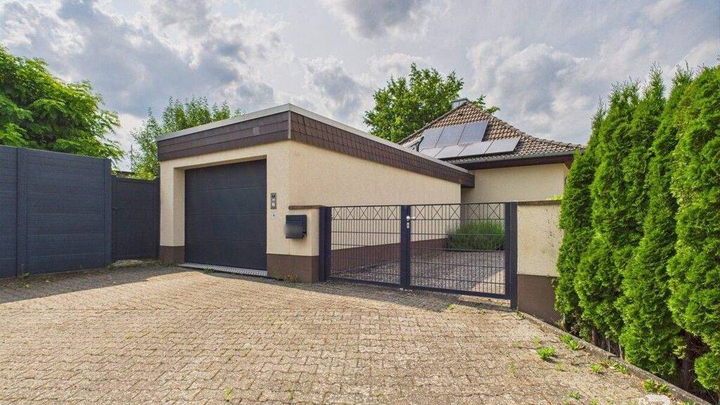 Der großzügig angelegte Garten bietet eine gelungene Mischung aus Beet- und Wiesenfläche mit Terrassenfläche und rundet das Immobilienangebot mit einem Gerätehaus ab. Das gesamte Grundstück ist eingezäunt und über eine Toreinfahrt neben der frontal gelegenen Garage zu betreten.